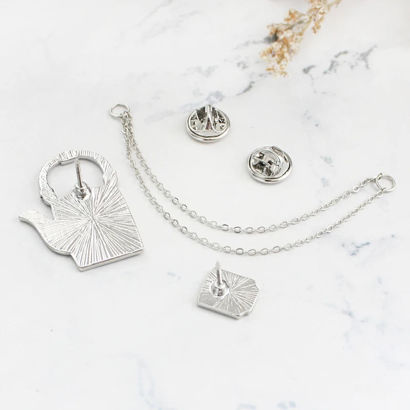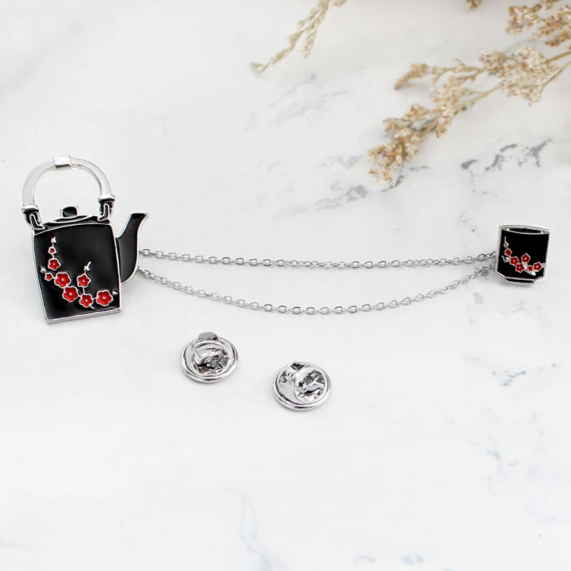 Hot Vintage Red Plum Teapot Teacup Chinese Style with Chain Metal enamel Pins Lapel Clothes Pants Jewelry